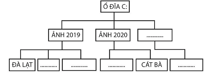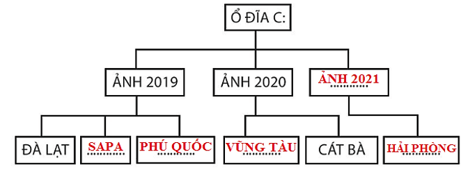 Năm 2019 gia đình Khoa có ba chuyến đi là: thăm thành phố Đà Lạt, thăm thành phố Sa Pa và tắm biển ở Phú Quốc. Năm 2020 có hai chuyến đi là: thăm thành phố Vũng Tàu, thăm đảo Cát Bà. Năm 2021 do dịch Covid-19 nên cả nhà chỉ về thăm quê ngoại ở Hải Phòng. Em hãy biểu diễn cách sắp xếp các thư mục ảnh trong máy tính của gia đình bạn Khoa bằng sơ đồ hình cây bằng cách điền tên thư mục vào hình dưới đây.