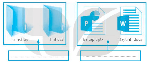 Vở bài tập Tin học lớp 3 trang 34 Câu 7: Hãy quan sát các hình và điền các từ, cụm từ: tệp, thư mục vào chỗ chấm cho thích hợp.