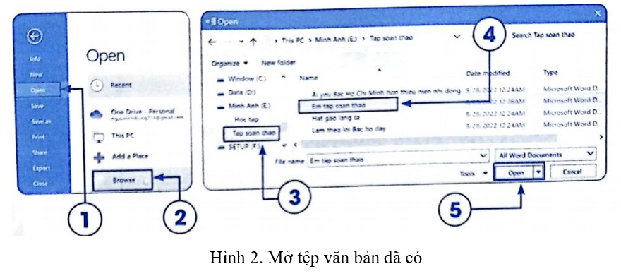 Câu hỏi 22 trang 30 Vở bài tập Tin học lớp 4: Các số trong Hình 2 thể hiện thứ tự các bước mở tệp văn bản đã có để xem và sửa. Hãy ghép các thao tác sau đây cho từng bước này. Kết quả được đưa ra dưới dạng cặp ghép (số thứ tự bước, nhãn của thao tác).