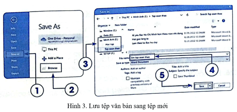 Câu hỏi 23 trang 31 Vở bài tập Tin học lớp 4: Các số trong Hình 3 thể hiện thứ tự các bước Lưu tệp văn bản vào một tệp mới với tên khác. Hãy ghép các thao tác sau đây cho từng bước này. Kết quả được đưa ra dưới dạng cặp ghép (số thứ tự bước, nhãn của thao tác).