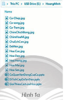 Câu 7 trang 20 Vở bài tập Tin học lớp 4: Trong USB của bạn Hoàng Minh có thư mục HoangMinh chứa các tập ảnh và tệp trình chiếu (PowerPoint} như ở Hình 1a. Em hãy thực hiện các thao tác với thư mục, tệp để được cây thư mục như ở Hình 1b. Sao chép hoặc di chuyển các tệp vào các thư mục sao cho hợp lí, thuận tiện cho việc tìm kiếm, sử dụng.