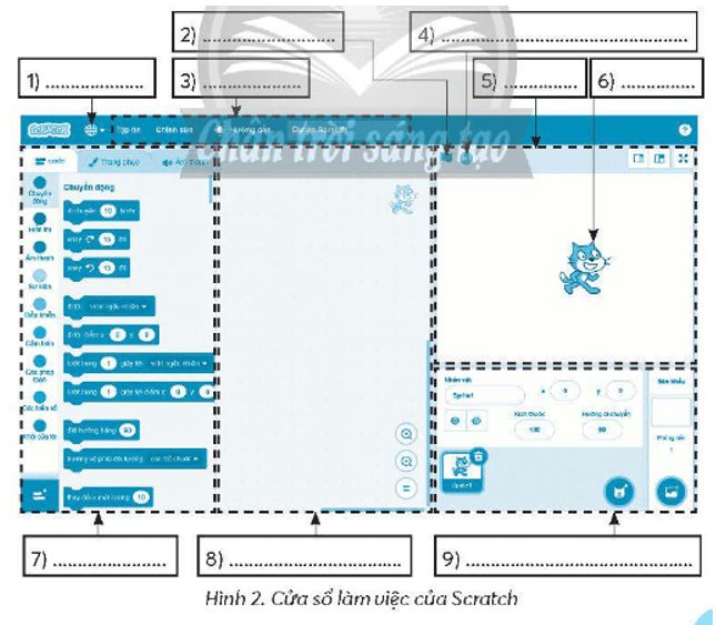 Câu 15 trang 69 Vở bài tập Tin học lớp 4: . Điền cụm từ thích hợp vào chỗ chấm để chú thích cho cửa sổ làm việc của Scratch.