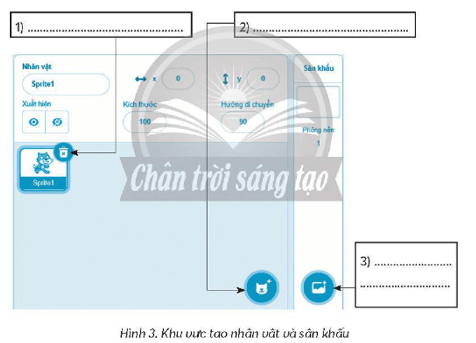 1) Nút lệnh xoá nhân vật, 2) Nút lệnh thêm nhân vật, 3) Nút lệnh thay đổi sân khấu (phông nền).