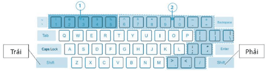 Khi gõ kí tự trên của phím có hai kí tự, do tay trái phụ trách thì nhấn và giữ phím Shift trái và ngược lại khi gõ kí tự trên Của phím có hai kí tự, do tay phải phụ trách thì nhấn và giữ phím Shift phải.
