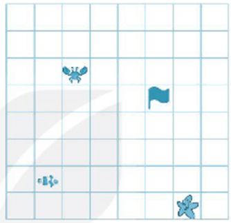 b) Biết lá cờ ở ô cố định; cá, cua và sao biển có thể quay trái, quay phải và di chuyển thẳng theo từng bước. Em hãy viết các chỉ dẫn (đi thẳng ... bước, quay trái, quay phải) để cá, cua và sao biển đi đến ô có lá cờ.
