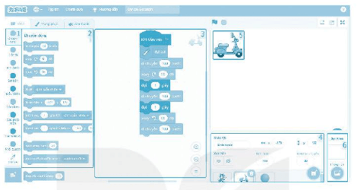 Câu 3 trang 54 Vở bài tập Tin học lớp 4: Điền các mô tả cho màn hình của phần mềm Scratch (Nhóm lệnh, Nhân vật trên sân khấu, Vùng tạo chương trình, Vùng tạo nhân vật, Vùng tạo phông nền sân khấu).
