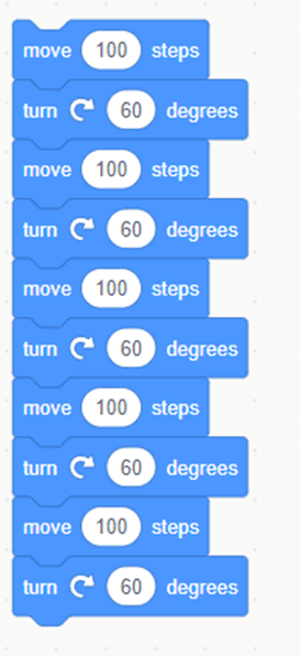 a) Nhân vật di chuyển 100 bước và quay 60 độ. Tiếp tục di chuyển và quay như vậy thêm 5 lần nữa. Hỏi nhân vật sẽ di chuyển theo hình gì?