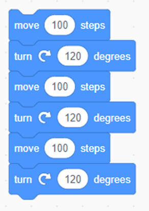 b) Nhân vật di chuyển 100 bước và quay 120 độ. Tiếp tục di chuyển và quay như vậy thêm 2 lần nữa. Hỏi nhân vật sẽ di chuyển theo hình gì?