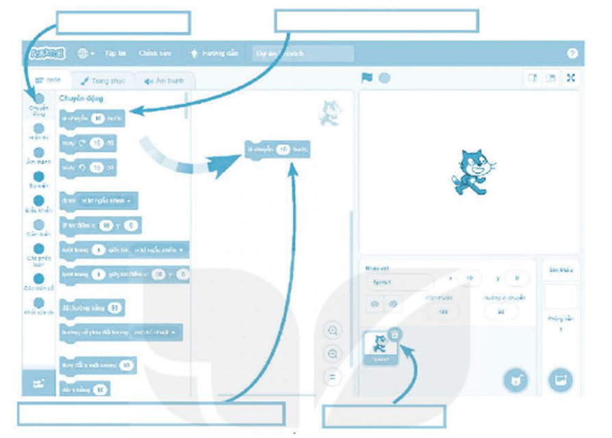 Câu 2 trang 58 Vở bài tập Tin học lớp 4: Em hãy sắp xếp các bước sau cho đúng thứ tự thực hiện đưa lệnh vào chương trình cho một nhân vật: