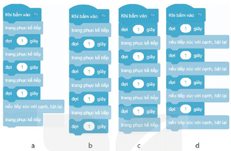 Câu 3 trang 66 Vở bài tập Tin học lớp 4: Bạn Minh muốn thêm các câu lệnh để chú chó thực hiện bốn lần các hành động đợi trong 1 giây và thay đổi hình dạng. Hãy chọn chương trình thực hiện đúng yêu cầu của Minh trong các chương trình sau.