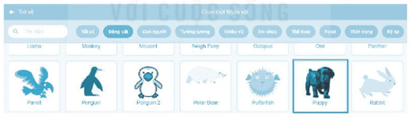 và chọn nhân vật chú chó từ thư viện như hình minh hoạ sau