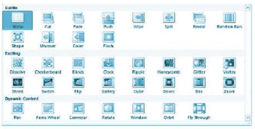 Mỗi trang chiếu sử dụng được nhiều kiểu hiệu ứng. |