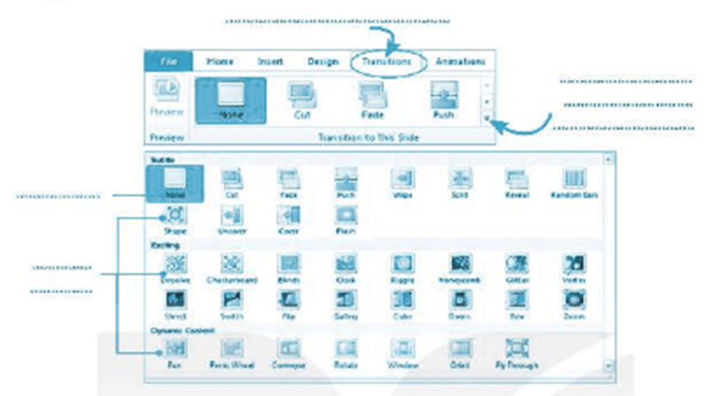Câu 5 trang 39 Vở bài tập Tin học lớp 4: Điền từ/cụm từ thích hợp (Chọn dải lệnh Transitions; Nháy nút này để xuất hiện danh sách các kiểu hiệu ứng; Bỏ hiệu ứng; Các kiểu hiệu ứng) vào chỗ chấm trong hình sau: