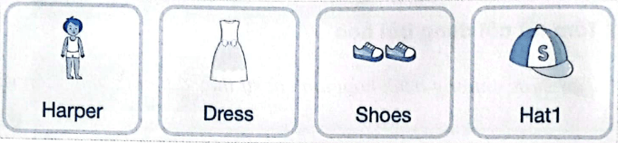 b) Sắp xếp các nhân vật để thể hiện Harper đang đội mũ, mặc váy, đi giày như hình bên:
