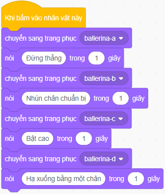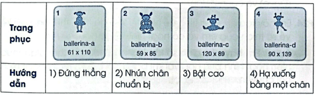 Câu hỏi và bài tập 20 trang 42 VBT Tin học lớp 5: Em hãy tạo chương trình Hướng dẫn múa có nhân vật vũ công Ballerina. Nhân vật sẽ hiển thị lần lượt từng động tác múa, mỗi động tác, vũ công sẽ nói hướng dẫn động tác như hình sau đây: