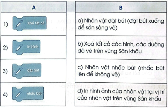 Câu hỏi và bài tập 1 trang 36 VBT Tin học lớp 5: Em hãy ghép mỗi lệnh ở cột A với một mô tả ở cột B.
