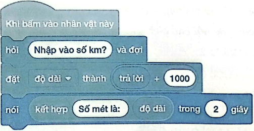 Câu hỏi và bài tập 41 trang 50 VBT Tin học lớp 5: Dũng tạo chương trình như hình sau đây để nhập vào độ dài theo km rồi hiển thị số mét tương ứng. Tuy nhiên chương trình cho kết quả sai. Em hãy giúp Dũng tìm nguyên nhân lỗi và sửa lại chương trình.