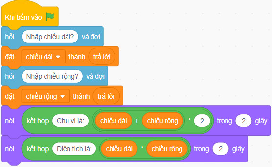 Câu hỏi và bài tập 43 trang 50 VBT Tin học lớp 5: Tạo chương trình nhập chiều dài và chiều rộng của hình chữ nhật rồi hiển thị chu vi và diện tích của hình chữ nhật đó.