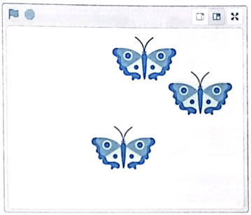 Câu hỏi và bài tập 8 trang 39 VBT Tin học lớp 5: Em hãy tạo chương trình vẽ 3 con bướm tại vị trí bất kì trên vùng Sân khấu và thực hành chạy chương trình như hình sau đây: