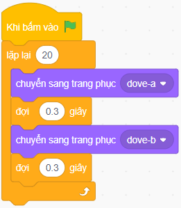 Câu hỏi và bài tập 23 trang 44 VBT Tin học lớp 5: Em hãy tạo chương trình hoạt hình Chim Bồ Câu (Dove) vỗ cánh 20 lần.