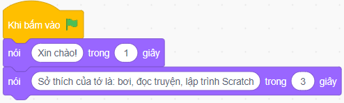 Câu hỏi và bài tập 24 trang 44 VBT Tin học lớp 5: Em hãy tạo chương trình để nhân vật Giga hiển thị bóng nói kể về sở thích của em và có hoạt hình Giga nói chuyện.