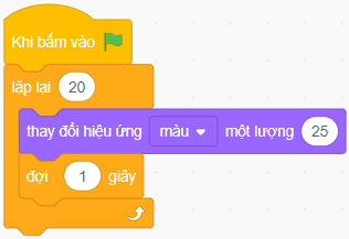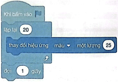 Câu hỏi và bài tập 22 trang 44 VBT Tin học lớp 5: Minh tạo chương trình như hình bên để thay đổi hiệu ứng màu của phông nền 20 lần, mỗi lần cách nhau 1 giây. Tuy nhiên, chương trình không thực hiện theo mong muốn của Minh. Em hãy giúp Minh tìm nguyên nhân lỗi và sửa lại chương trình.