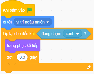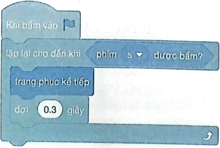 Do khối lệnh sử dụng lệnh lặp lại có điều kiện, lặp lại hành động thay trang phục cho tới khi phím s được bấm.