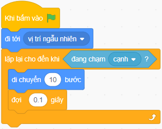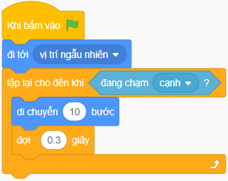 Câu hỏi và bài tập 27 trang 46 VBT Tin học lớp 5: Huyền tạo chương trình để nhân vật di chuyển từ một vị trí ngẫu nhiên tới khi chạm cạnh của vùng Sân khấu thì dừng lại như hình bên. Tuy nhiên, Huyền quên chưa chọn điều kiện dừng lặp. Em hãy giúp Huyền chọn điều kiện dừng lặp phù hợp.