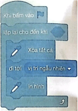Câu hỏi và bài tập 28 trang 46 VBT Tin học lớp 5: Hưng tạo chương trình như hình bên để vẽ hình ngôi sao (Star) tại các vị trí ngẫu nhiên trên vùng Sân khấu. Chương trình sẽ ngừng vẽ khi nháy chuột máy tính.