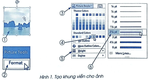 Câu hỏi và bài tập 11 trang 25 VBT Tin học lớp 5: Hình 1 trình bày các thao tác tạo khung viền cho ảnh. Em hãy cho biết nội dung của từng thao tác tại các vị trí đánh số.