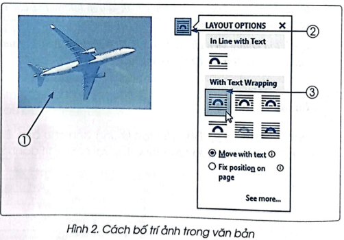 Bước 5. Chọn ảnh rồi kéo thả chuột trên các điểm mốc của ảnh để thay đổi kích thước ảnh. Thay đổi kiểu bố trí ảnh trong văn bản như hướng dẫn ở Hình 7 (SGK, trang 33) và di chuyển ảnh đến vị trí theo yêu cầu.