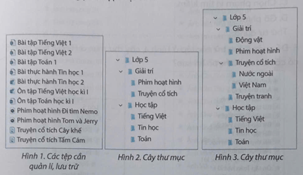 Câu 3 trang 15 Vở bài tập Tin học lớp 5: Để quản lí, lưu trữ các tệp ở Hình 1, cây thư mục ở Hình 2 hay Hình 3 có cấu trúc không phù hợp? Tại sao?
