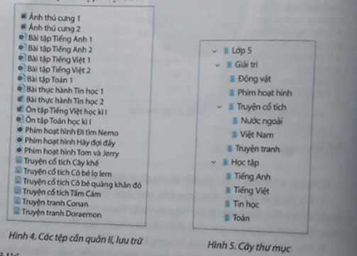 Câu 6 trang 16 Vở bài tập Tin học lớp 5: Để quản lí, lưu trữ các tệp ở Hình 4, cây thư mục ở Hình 3 hay Hình 5 có cấu trúc phù hợp? Tại sao?