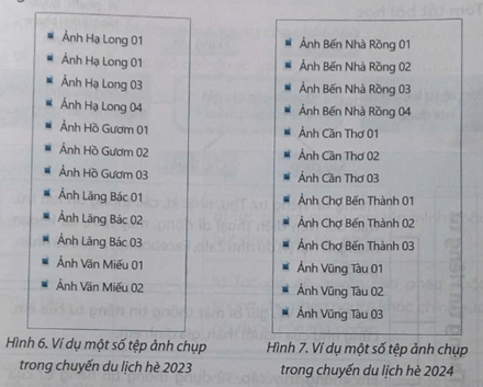 Tạo cây thư mục có tên là Ảnh du lịch, trong đó có các thư mục để lưu trữ theo ảnh du lịch theo năm (ví dụ: Năm 2023, Năm 2024, ...). Trong thư mục của từng năm, có các thư mục con tương ứng với các địa điểm du lịch (ví dụ, trong thư mục Năm 2023 có các thư mục Hạ Long, Hồ Gươm, Lăng Bác, Văn Miếu,...).