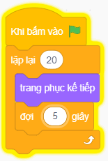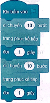 Trong chương trình đó, khối lệnh di chuyển 10 bước, trang phục kế tiếp, đợi 1 giây được lặp lại và lặp lại 1 lần?