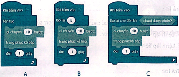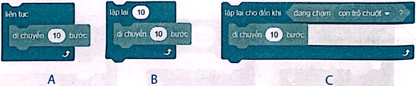 Ở lệnh C, thực hiện lặp lại hành động di chuyển 10 bước cho tới khi chạm vào con trỏ chuột