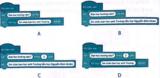 Câu 9 trang 67 Vở bài tập Tin học lớp 5: Chương trình nào thực hiện ý tưởng: Chương trình đưa ra câu hỏi “Bạn học trường nào?”.