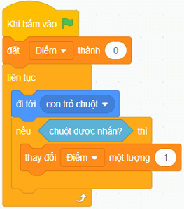 - Lặp lại liên tục hành động của nhân vật di chuyển đi tới con trỏ chuột và nếu nháy chuột thì tăng điểm thêm 1.