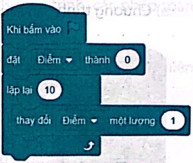 Biến Điểm ban đầu có giá trị bằng 0. Sau khi thực hiện lặp lại 10 lần hành động tăng giá trị của biến thêm 1 thì biến có giá trị là 0 + 1 × 10 = 10