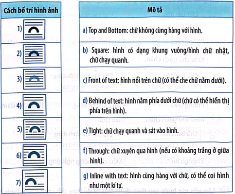 Câu 7 trang 26 Vở bài tập Tin học lớp 5: Ghép mỗi cách bố trí hình ảnh với mô tả phù hợp.