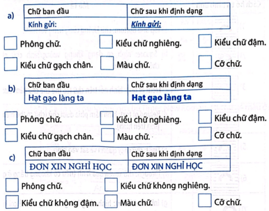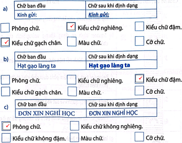 Câu 4 trang 25 Vở bài tập Tin học lớp 5: Quan sát chữ ban đầu và chữ đã định dạng rồi đánh dấu ✓ vào các định dạng đã được sử dụng cho chữ.