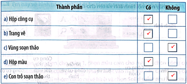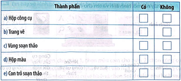 Câu 4 trang 34 Vở bài tập Tin học lớp 5: Màn hình làm việc của phần mềm đồ hoạ thường có các thành phần nào? Đánh dấu ✓ vào ô Có/Không tương ứng.