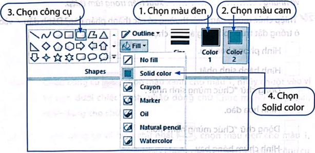 Bước 1. Chọn màu đen cho màu 1, chọn màu cam cho màu 2, chọn công cụ Rounded Rectangle. Nháy chuột vào mũi tên bên cạnh công cụ Fill ở bên trái nhóm công cụ vẽ hình và chọn Solid color như hình sau: