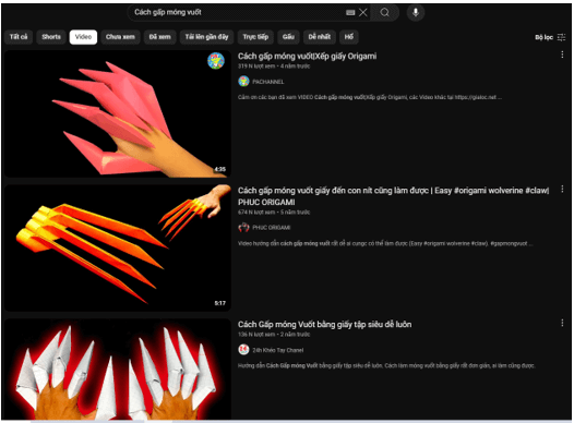 - Truy cập vào Youtube, gõ từ khóa “Cách gấp móng vuốt” vào ô tìm kiếm