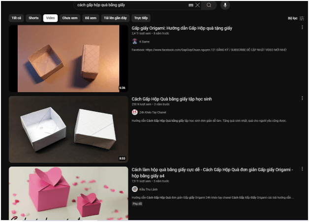 - Truy cập vào Youtube, gõ từ khóa “cách gấp hộp quà bằng giấy” vào ô tìm kiếm