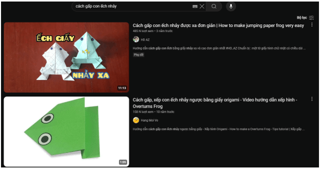 - Truy cập vào Youtube, gõ từ khóa “cách gấp con ếch nhảy” vào ô tìm kiếm