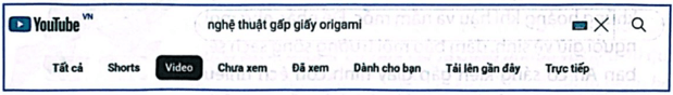 Câu 4 trang 45 Vở bài tập Tin học lớp 5: Sử dụng từ khoá “cách gấp giấy rồng origami” để tìm trong YouTube một video hướng dẫn gấp giấy hình con rồng theo phương pháp origami. Làm theo hướng dẫn của video để tạo ra một hình rồng bằng giấy.