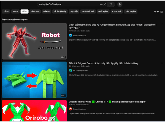 - Truy cập vào Youtube, gõ từ khóa “cách gấp rô-bốt origami” vào ô tìm kiếm