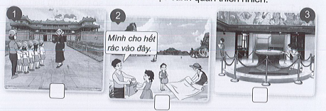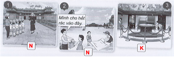 Vở bài tập Tự nhiên xã hội lớp 3 trang 35 bài 3: Viết chữ N vào ô trống dưới hình thể hiện việc nên làm, viết chữ K vào ô dưới hình thể hiện việc không nên làm khi đi tham quan di tích lịch sử - văn hóa hoặc cảnh quan thiên nhiên.