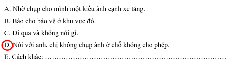 Khi gặp tình huống trên em sẽ khuyên hai bạn đây là khu di tích lịch sử, các bạn không nên trèo qua hàng rào để vào chụp ảnh cùng hiện vật. Việc này có thể làm hỏng hóc, xước xát lên hiện vật. Nếu muốn chụp ảnh thì có thể đứng ngoài hàng rào và chụp.